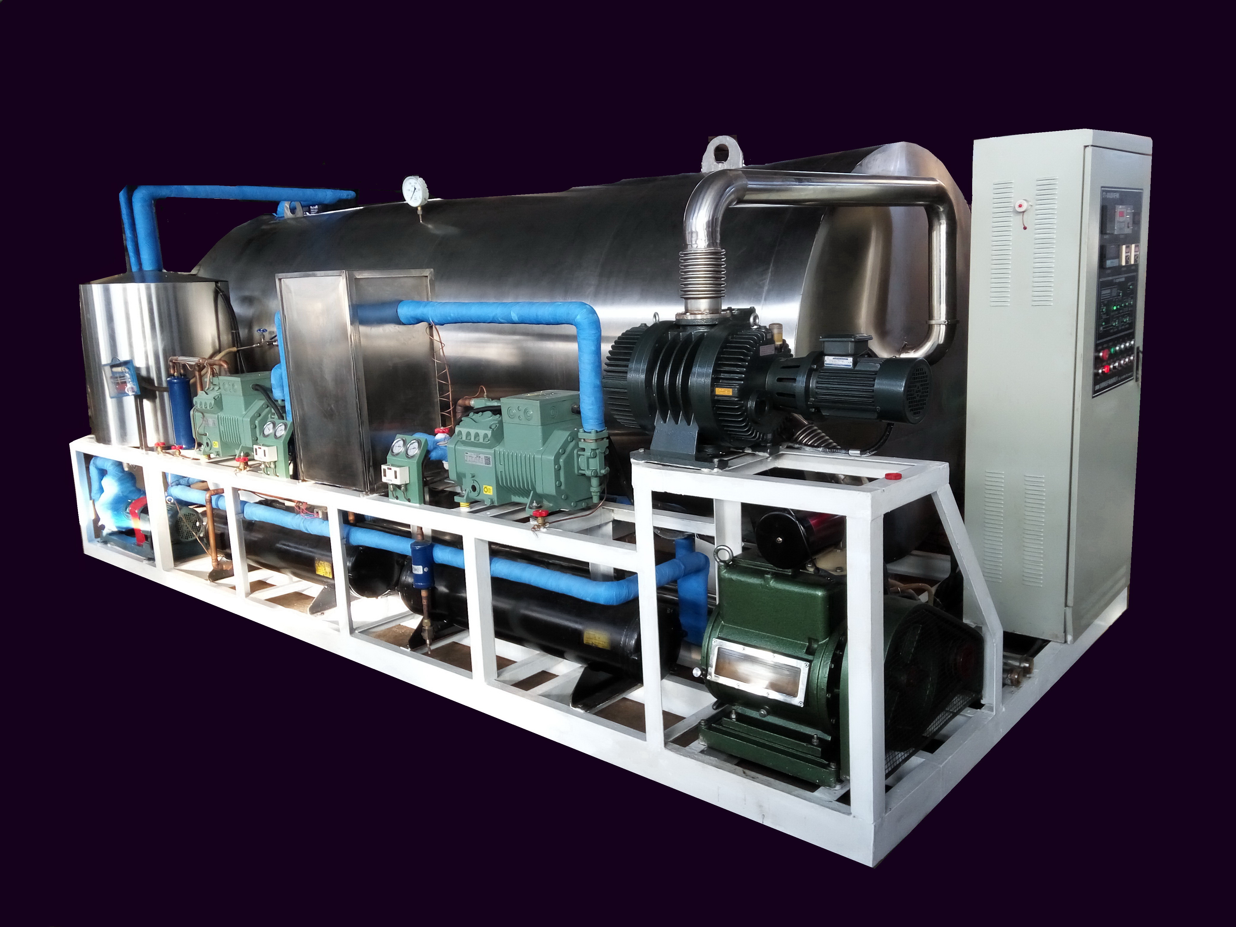 DT系列真空冷凍干燥機是利用升華原理將物料中的水預先凍結成冰以后在真空環境下脫除的一款干燥設備,區別于普通干燥設備的是經該機脫水后的物料外形色澤和成分均可以保持原狀,組織多孔酥松,尤其粉體物料凍干后微觀松散而不結團,極易溶于水。因此該機被廣泛應用于生物制品、中西藥品、藥用原料、各類濃縮液制粉、各類食品、超細微粉、催化劑、石墨烯等材料制備等各個行業。我國真空冷凍干燥機從20年前依賴進口到現在完全國產化,走過了漫長的發展歷程。本公司經近20年的不斷努力創新,所生產的DT系列凍干設備從最原始簡陋的機型到現在集多項先進技術于一身的現代機型,已經有了質的飛躍,主要經濟技術指標(包括干制品品質、運行穩定性、使用壽命、節能降耗等)均已達到世界先進水平。